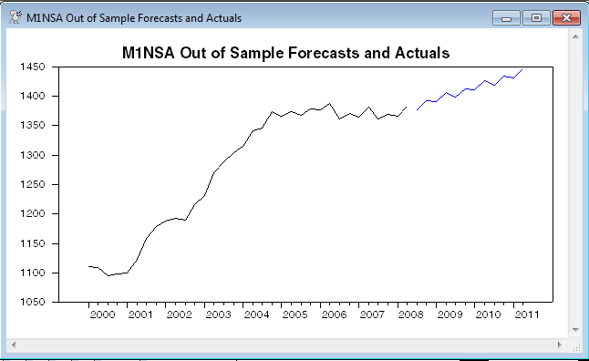 This estimates an ARIMA model with both regular and seasonal differences, and 1 AR and 1 seasonal MA, on the log of M1NSA (non-seasonally adjusted M1). The forecasts are computed over 2008:3 (written here as 2008:2+1 to make it clearer what the end of the estimate range is) to 2009:2. @BJFORE itself does not create any output, so we show the graph.