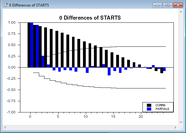 This does @BJIDENT on a series of housing starts. The output is shown below. For illustration, this includes the REPORT and QSTATS options, though there is little useful information in those. It's the graph of the correlations and partial autocorrelations that is most helpful. Here it would tend to show that the series is borderline between needing a difference, or being fit with an AR(2) as it stands.