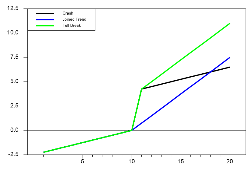 Perron’s original paper picked specific dates for the break based on the historical record. Most subsequent work, however, has allowed for the break to be data-determined. The general framework of the tests is: