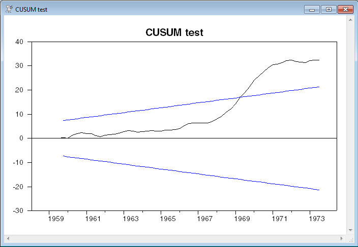 Next is the more formal CUSUM test (Brown, Durbin and Evans, 1975). Under the null, the cumulated sums of the recursive residuals should act like a random walk. If there is a structural break, they will tend to drift above the bounding lines, which here are set for the .05 level. (Graph).