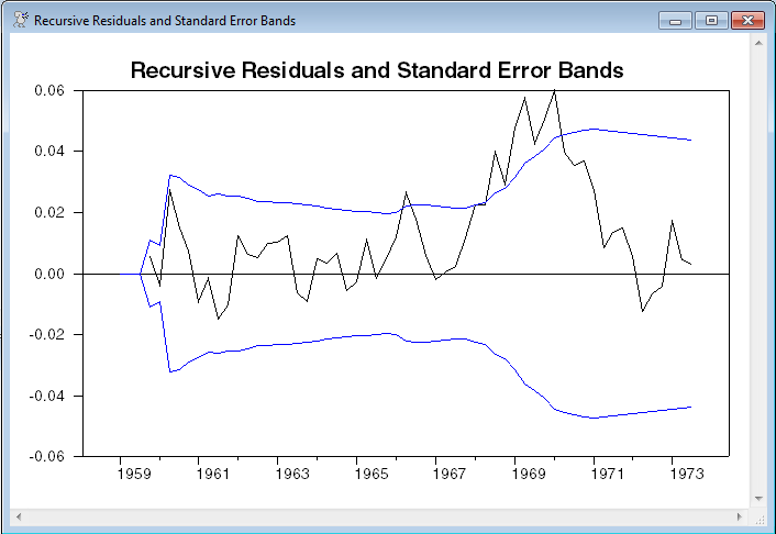 Next is a graph of the recursive residuals with the (recursively estimated) standard error bands. This doesn’t form a formal test; however, if there is a break, it’s likely that the residuals will, for a time, lie outside the bands until the coefficients or variance estimates adjust. (Graph).
