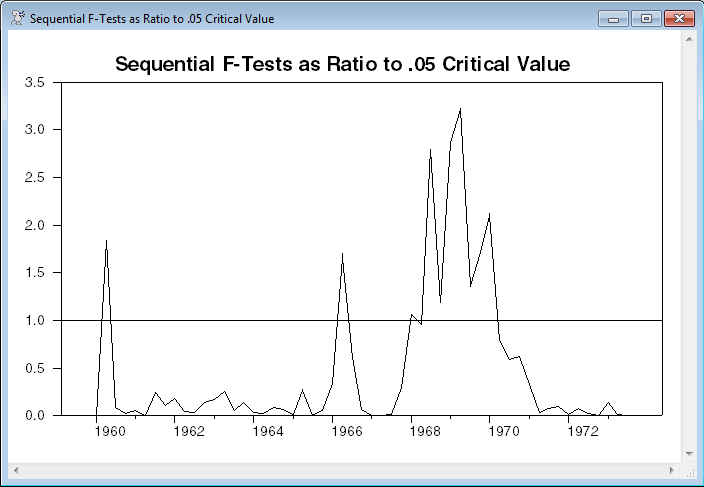 The final graph is a set of one-step Chow predictive F-tests. This is basically the same information as the recursive residuals graph with a different presentation. Again, this is an informal test. This graph is designed to present not the sequential F’s themselves, but the F’s scaled by the .05 critical value. At the start of the sample, the F’s are based upon very few denominator degrees of freedom, so F’s that are quite large may very well be insignificant. Anything above the “1” line (shown on the graph with the help of the VGRID option) is, individually, statistically significant at the .05 level. Consistent with the above, there is an indication of some form of break around 1968-1970.