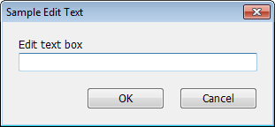 declare string result dbox(action=define,title="Sample Edit Text") dbox(stext="Edit text box") dbox(edittext,focus) result dbox(action=run) |
