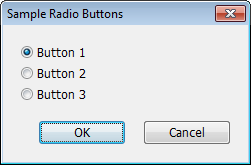 declare integer button dbox(action=define,title="Sample Radio Buttons") dbox(radio="Button 1",default=1) button dbox(radio="Button 2") dbox(radio="Button 3") dbox(action=run) |