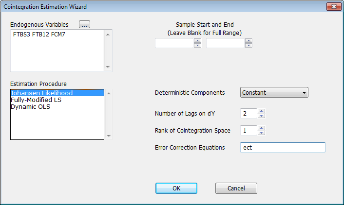 Selecting the Cointegration Estimation from the Time Series Menu brings up something like the following dialog box: