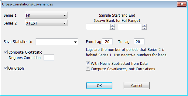 You can use the Cross Correlations Wizard on the Time Series Menu to generate cross-correlations for a pair of series. The Wizard generates a CROSS instruction. Selecting the Wizard brings up the following dialog box: