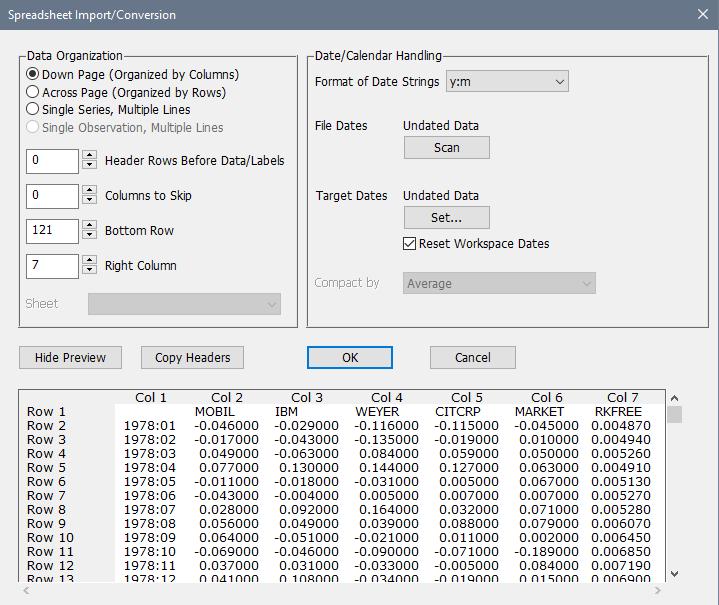 By default, this shows a preview of the data file. Note that the Row x and Col x fields aren't part of the file. You can use Hide Preview to get rid of that, though there is probably little reason to ever do that.