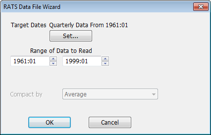 2) When you are ready to read data into memory, select (highlight) the series you want to read from the series list window, and then do Data (RATS Format) on the Data/Graphics menu. RATS will display a dialog box like this (this example is for a set of quarterly data series):