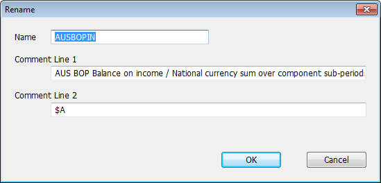 This dialog handles the series renaming operating in a RATS format file. A series in a RATS format file must have a legal RATS variable name, and can have associated with it up to two comment lines. Those are the fields in the dialog box. Click OK to accept the changes and Cancel to revert to the original name and comments.