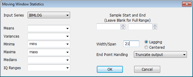 Use these radio buttons to choose either a centered window or a lagging window. A centered window computes the statistic for entry T using a data window centered over T, while a lagging window computes T using entries T-width+1 through T.