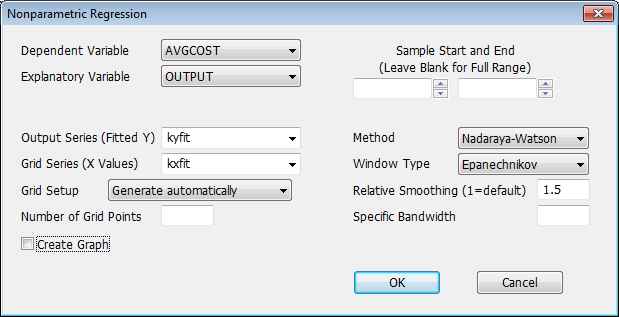 When using the Nadaraya-Watson method, use Window Type to select the window type, from "Epanechnikov", "Triangular", "Gaussian", "Logistic", "Flat", or "Parzen". By default, NPREG chooses a bandwidth based upon sample statistics for the X series which has certain optimality properties. The Relative Smoothing field allows you to increase the bandwidth proportionally to that. If, instead, you want a Specific Bandwidth, use the appropriate box for that. (If you put a value in Specific Bandwidth, that is what is used, so make sure it's blank if you want to use the Relative Smoothing.