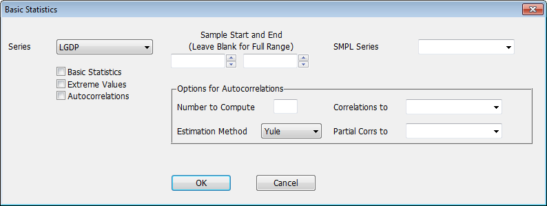Check the statistics that you want. Basic Statistics does a STATISTICS instruction, Extreme Values does an EXTREMUM, and Autocorrelations does a CORRELATE instruction.