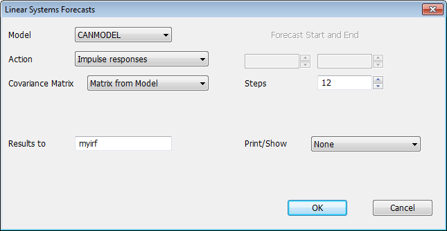 For the forecasting, simulation, and historical decomposition choices: If you only specify a value for Steps, computations will begin with the first period after the end of the most recent estimation range. If you prefer, you can use the Start field to specify a different starting period (leaving the End field blank and using Steps to control then number of periods computed).