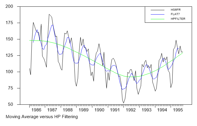 GRAPH(STYLE=LINE,FOOTER="Moving Average versus HP Filtering",KEY=UPRIGHT) 3