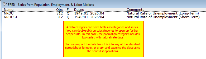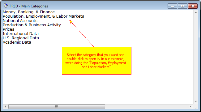 You can "drill down" through the categories to find the set of series that you want by double-clicking on the category to open up its sub-categories. In this case, we'll pick the "Population, Employment & Labor Markets" category, which includes both a number of subcategories and also some series. It's this type of Series List window which you will use to get data.