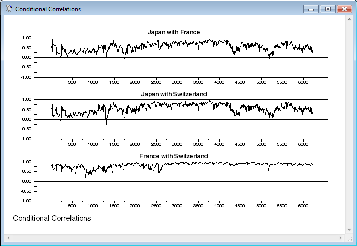 This generates and graphs the conditional correlations for the series from the DCC-Koutmos estimates. This can be done with any type of multivariate model (though a CC will be flat, so it won't be very interesting) as long as you save the series of covariance matrices using the HMATRICES option. In the SET instructions, %CVTOCORR(HH(T)) returns the covariance matrix converted to correlations, and the (i,j) subscripts pull that particular element out of the covariance matrix, so %CVTOCORR(HH(T))(1,2) is the conditional correlation of Japan (variable 1) with France (variable 2) at time T.