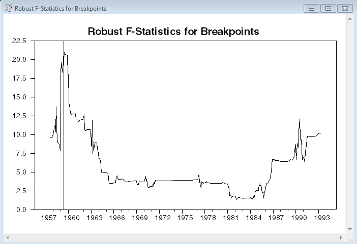 graph(grid=(t==bestbreak),header="Robust F-Statistics for Breakpoints")