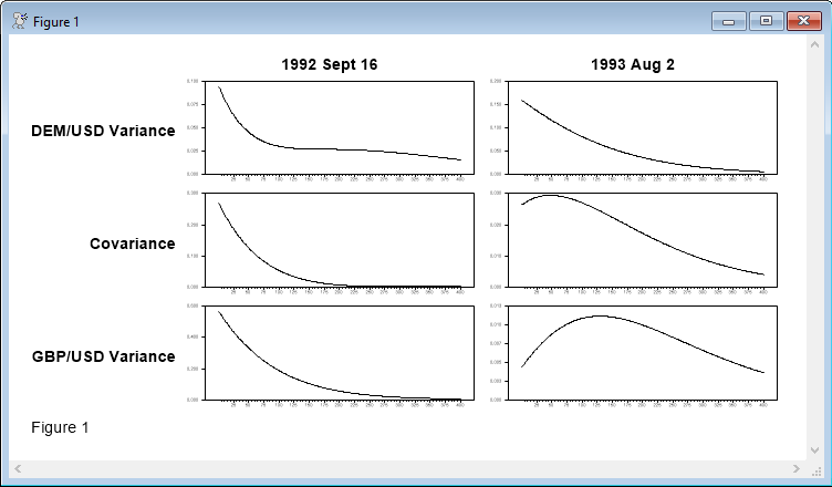 HH compute the VIRF from two episodes in the data. The first is "Black Wednesday'' (September 16, 1992), when the Italian lira and the UK dropped out of the European Exchange Rate Mechanism (ERM). The second is August 2, 1993, when the EC finance ministers changed the variability bands on currencies in the ERM. Responses for 400 steps (roughly 1 1/2 years with five day a week data) are computed.