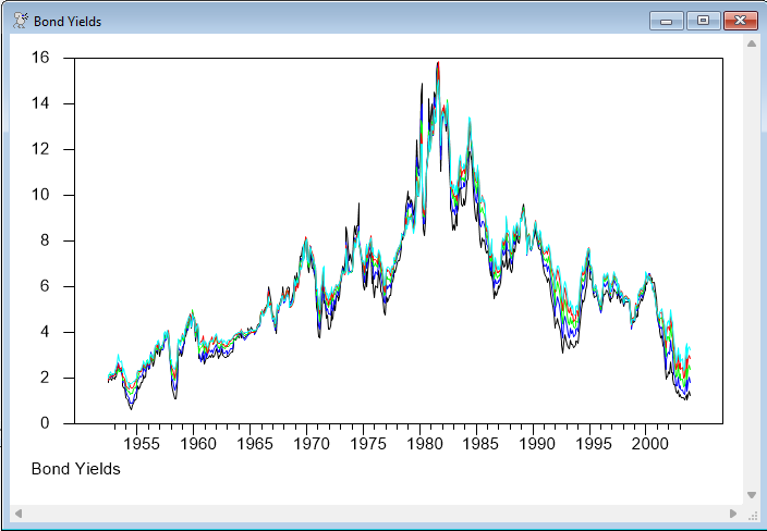 The program file hasbrouck_bonds.rpf uses a different data set than in the Hasbrouck paper, but applies the same technique. The data in this case are bond prices of different maturities. The data are monthly with zero-coupon equivalent bond prices for 1, 2, 3, 4 and 5 year. The following converts these to yield per annum. The first loop normalizes (they are based upon $100 face values, hence the /100 to change to a $1 face value), while the SET instructions convert the log discount over n years to the equivalent per annum rate.
