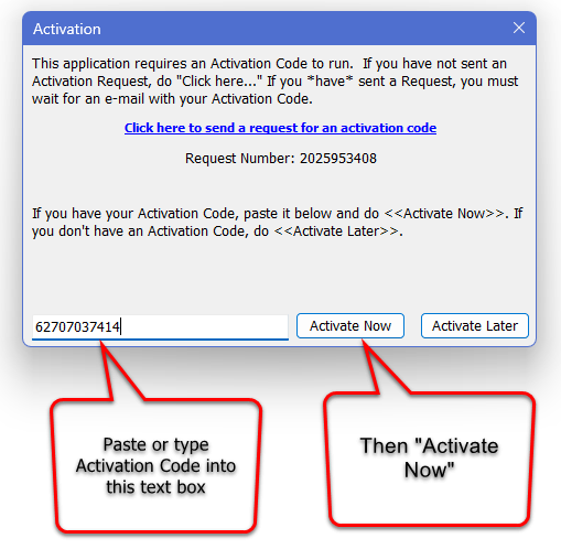 Copy the number out of the email and paste/type it into the text box at the lower left as was done here. Then push the "Activate Now" button. If all has gone correctly, you should be running the software without any further intervention. If not, you probably will have the message described below.