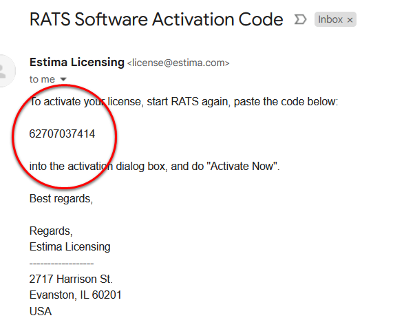 The Activation Code for the software is at the location circled. This is the number that will unlock the software. Once you have this e-mail, start the software again. If you see the Grace Period Dialog, do the "Activate Now" on it. Otherwise, you should again see the Activation Dialog.
