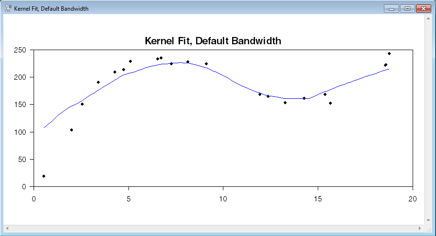 scatter(style=dots,overlay=line,ovsame,header="Kernel Fit, Default Bandwidth") 2
