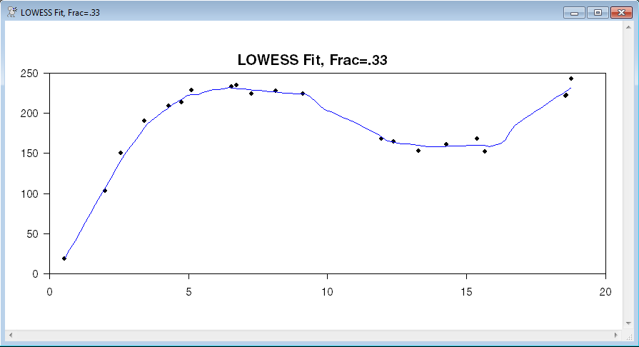 scatter(style=dots,overlay=line,ovsame,header="LOWESS Fit, Frac=.33") 2