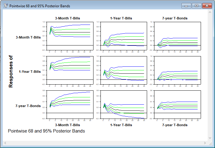 MONTEVECM.RPF is an example of Monte Carlo integration for the impulse responses for a VECM (Vector Error Correction Model). This requires RATS 9.2 or later. This is based upon the ECT.RPF example which does a more thorough analysis of the unit root and cointegration properties of the data. The analysis is of three series of US Treasury yields (FTBS3 is the 3-month T-bill rate, FTB12 is the 12-month T-bill rate and FCM7 is the 7-year bond rate).