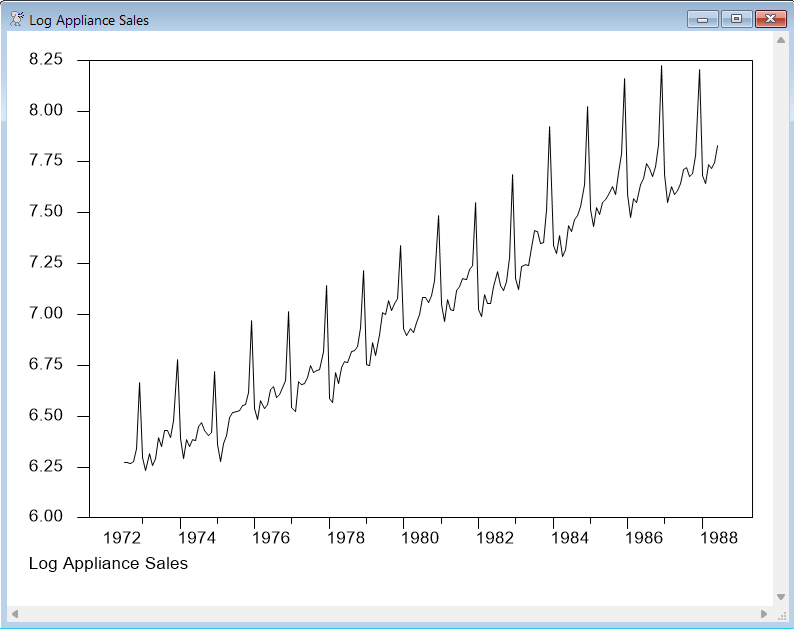 This analyzes a series of (raw) household appliance sales. (This is an example file for Census X12). Because sales are higher on certain days of the week (Friday, Saturday and Sunday), there is a “trading day” effect in the data. We also need to account for a predictable “leap year” effect, since a February with a leap year has one extra day to sell appliances than Februaries which don’t.