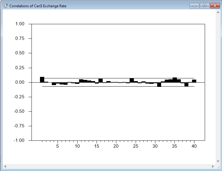 Next, it does the same type of test using the procedure @REGCORRS, which also will produce both a table of correlations and tests, and a graph of the autocorrelations. The overall impression here is that there may be some autocorrelation at lag 1 (only) that might be worth some attention.
