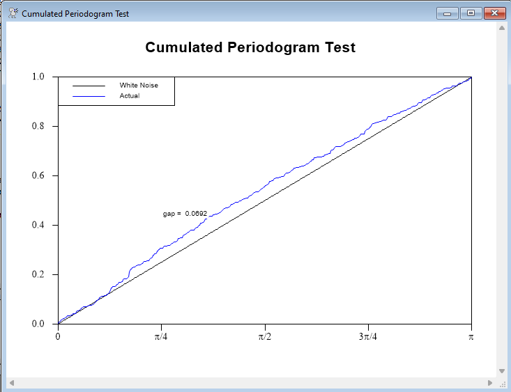 The cumulated periodogram test does a test for white noise in the frequency domain. This provides both a report on the Kolmogorov-Smirnov test, and a graph of the difference between the observed spectrum and the spectrum of white noise. The largest gap is between the .01 and .05 significance level.