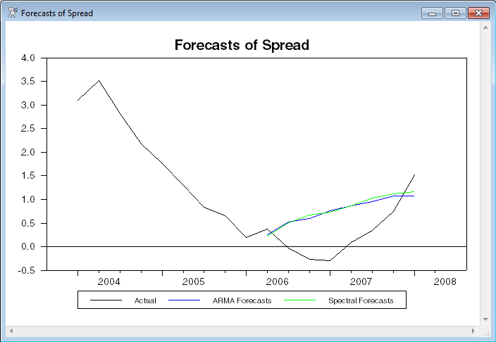 graph(header="Forecasts of Spread",key=below,klabels=||"Actual","ARMA Forecasts","Spectral Forecasts"||) 3