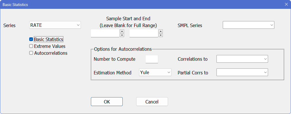 The “Format of Date Strings” field shows what RATS thinks is the format of the date information on the file (if any). If it thinks there is more than one possible interpretation, you can use this field to select from the choices it offers. Here, RATS has correctly guessed that the dates are in the “year:month” form (abbreviated “y:m”).