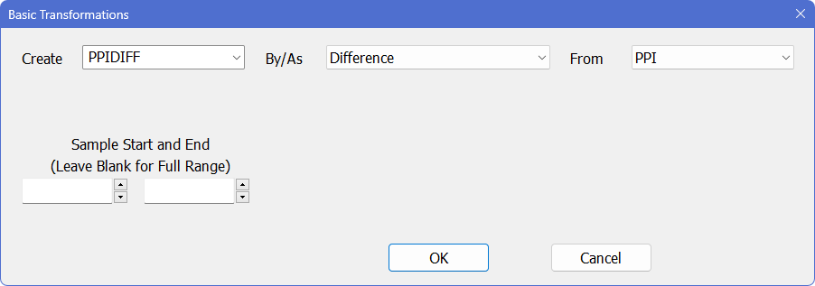 For example, another way to create PPIDIFF as the first difference of PPI is to select Data/Graphics—Transformations, type in the name PPIDIFF in the “Create” field, select “Difference” from the “By/As” field, and select PPI in the “From” drop-down list: