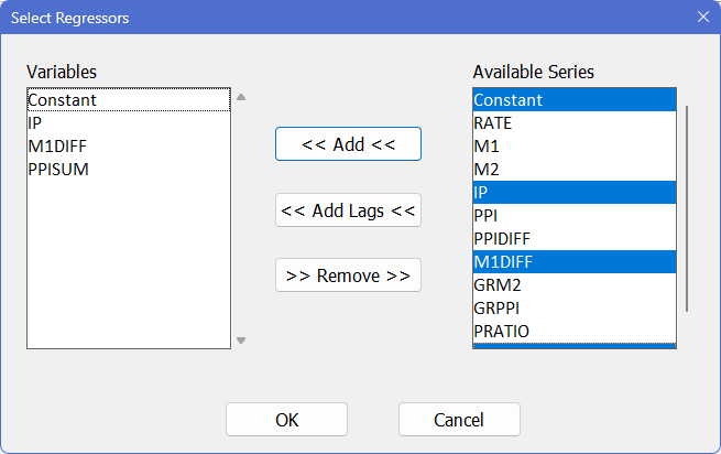 You can add variables from the “Available Series” list to the regression by: double-clicking on a series name in the “Available” list; selecting one or more series and clicking the