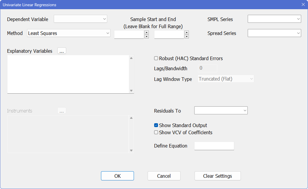 Next, we need to select the explanatory variables. You can type the regressors directly into the “Explanatory Variables” field (using blank spaces to separate variables), or you can click on the