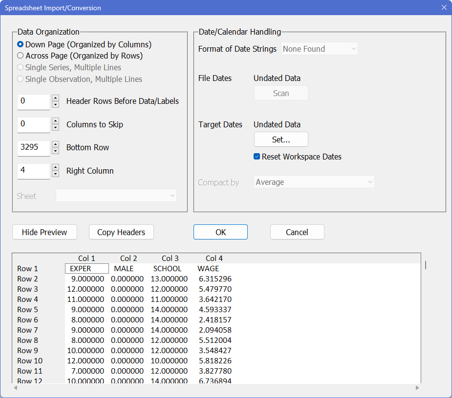 To get started, close the windows from the previous session and do File—New—Editor/Text Window to create a new input window. When you are ready, select the Data/Graphics—(Other Formats) operation and open the file WAGES1.DAT. (you may need to select “Text Files (*.*)” from the list of formats in order to see the file in the dialog box). Click on “Show Preview” (if necessary) to examine the data on the file: