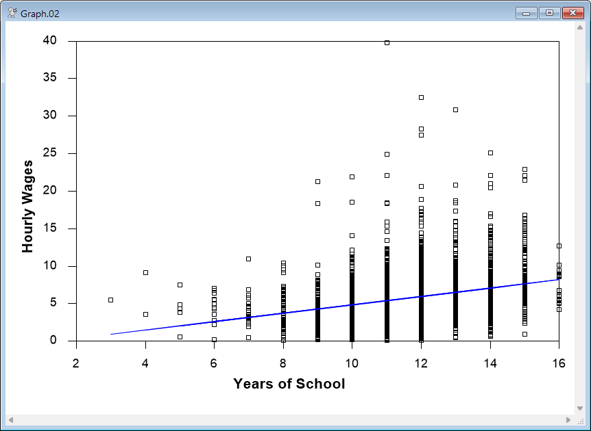 SCATTER(STYLE=SYMBOLS,OVERLAY=LINES,OVSAME,VLABEL="Hourly Wages",HLABEL="Years of School") 2