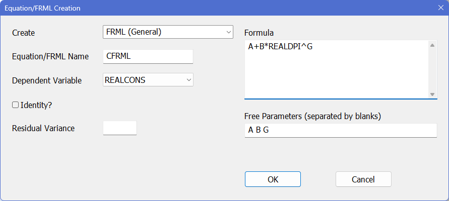 Choose “FRML (General)” from the “Create” popup menu. Choose the name that you want to assign to this formula in the “Equation/FRML Name” box; we’ll use CFRML. Choose the dependent variable (REALCONS) in the “Dependent Variable” popup. Put in the names A B G in the “Free Parameters” box and the formula A+B*REALDPI^G in the “Formula” box. As you can see, since you have to type in both the formula and the parameter names, there isn’t all that much that the wizard really does other than help you make sure you get all the information in. For instance, if you just put in the formula definition without providing the A B G names, you will get an error message that A is unrecognizable when you try to OK the dialog.
