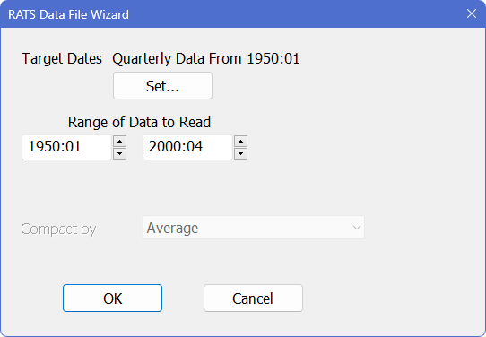 Of the five series on the file, we need only two: REALCONS and REALDPI. Select those two (click on one of the series, then <Ctrl>+click or <Command>+click on the second), and choose the Data/Graphics—Data (RATS Format) menu operation. This will pop up the following dialog box: