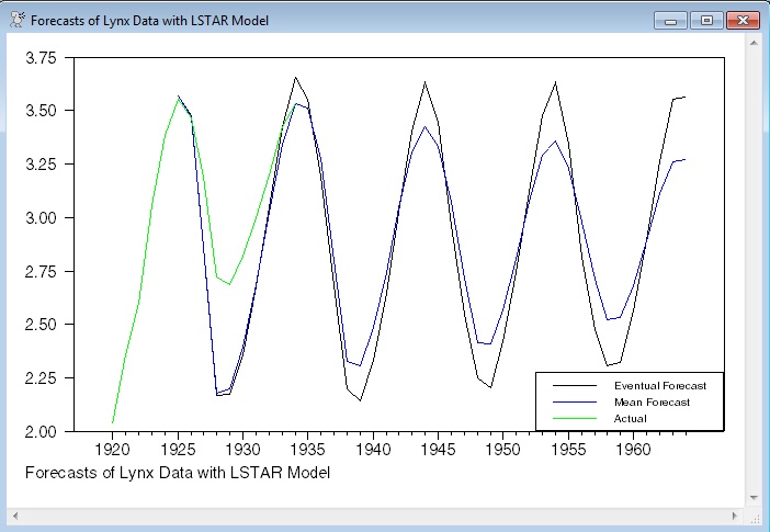 TARMODELS.RPF is an example of estimation and analysis of a STAR (Smooth Transition Autoregression) model. It is based on example 3 from Terasvirta(1994). The Canadian lynx population is a standard data set in the non-linear time series literature. The population fluctuates because a high population causes depletion of their food source (lynx are a small wild cat), causing a rapid die-off due to starvation. When the population is low, it can only be rebuilt through reproduction. Thus the up cycles and down cycles are driven by completely different mechanisms, suggesting that a threshold effect is likely.