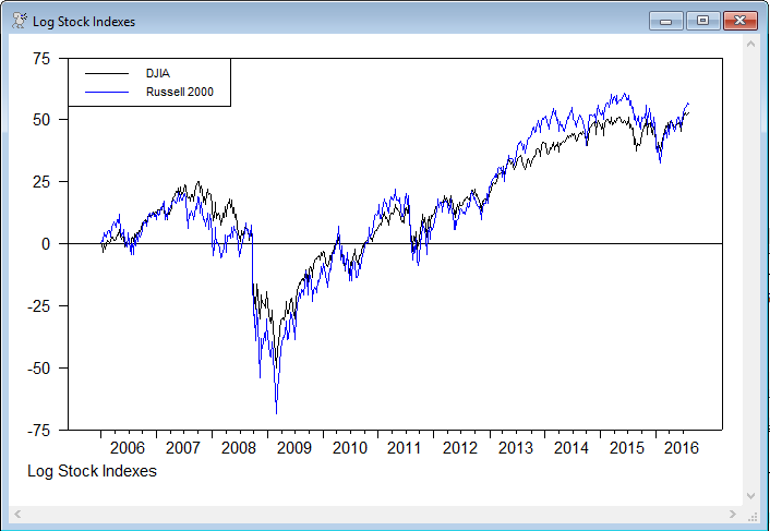 graph(footer="Log Stock Indexes",key=upleft,klabels=||"DJIA","Russell 2000"||) 2