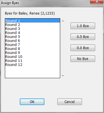As you can see, the dialog box displays the player's name at the top, a list of rounds for you to choose from, and push buttons for assigning full-point, half-point, or zero-point byes. There is also a push-button for No Bye which can be used to clear a previously assigned bye. Click on the round in the scrolling list, then click on the button to set or reset the information. (You can only change one round at a time).