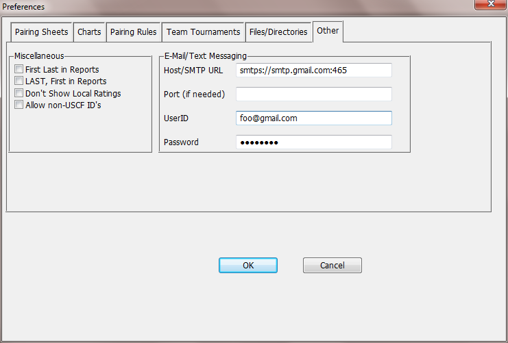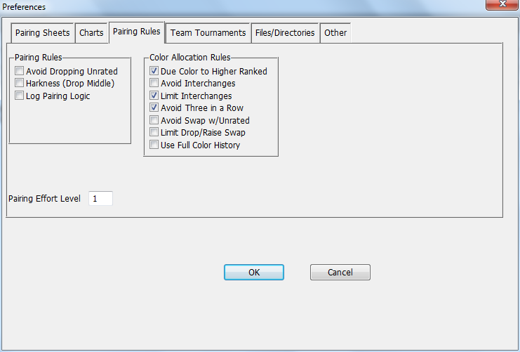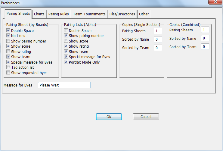 Use these fields to specify how many copies of each type of pairing sheet (sorted by Boards, by Name, and by Team) will be printed when you Print Pairing Sheets. Note that you can override this when you do the printing---this just determines how the dialog is initially set.