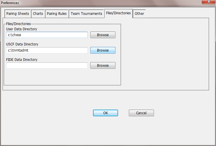 These are the three default directories used for various purposes. Other than the USCF, it isn't generally necessary to set these. These can be set here on using the corresponding menu operations (File-User Directory, USCF-USCF Directory).