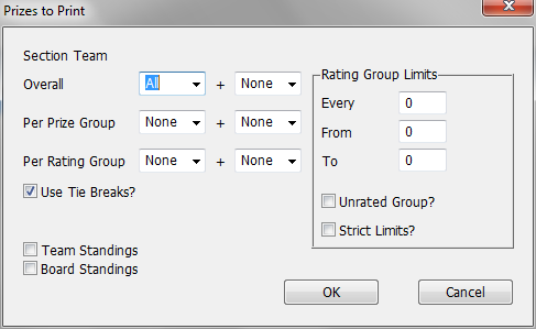 The number of prizes per rating group, as you define in the group box on the right side of the dialog box. WinTD does the same number for each group. + Ties will show you any players tying for the final place.