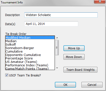 All of the tie break methods supported by WinTD are listed here, in the current order of importance. The method at the top of the list will be used as the first tie break. The next method in the list is used as the next tie breaker, and so on. To change the ordering, select one of the methods by clicking on it. Then click on either the Move Up or Move Down button to move the selected method up or down in the list. See Tie Breakers for technical details on the tie breakers.