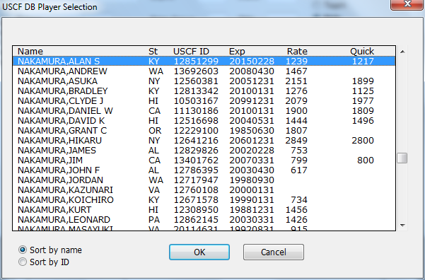 This dialog box pops up when you push the From USCF button in the Add/Edit a Player dialog box. It has a scrolling box with the current contents of the USCF database that you've downloaded. It will be positioned based upon any information that you've put into the Name or ID fields in the parent dialog box. In this case, we put Nakamura in the Name field, so it positions to the first match for the name.