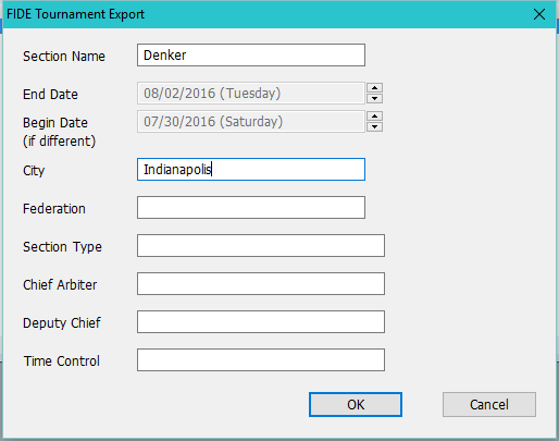 Once you're ready, do FIDE-Make FIDE Report. This will pop up a "FIDE Tournament Export" dialog as shown below: