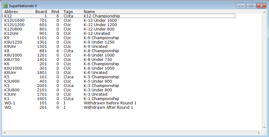 The name of the tournament (set by the "Description" field in the Tournament Info Dialog Box) appears on the title bar of the window. For each section, the window displays the short and full titles, the starting board number, and the number of rounds paired. WinTD also uses several one-letter "tags" to indicate various information: